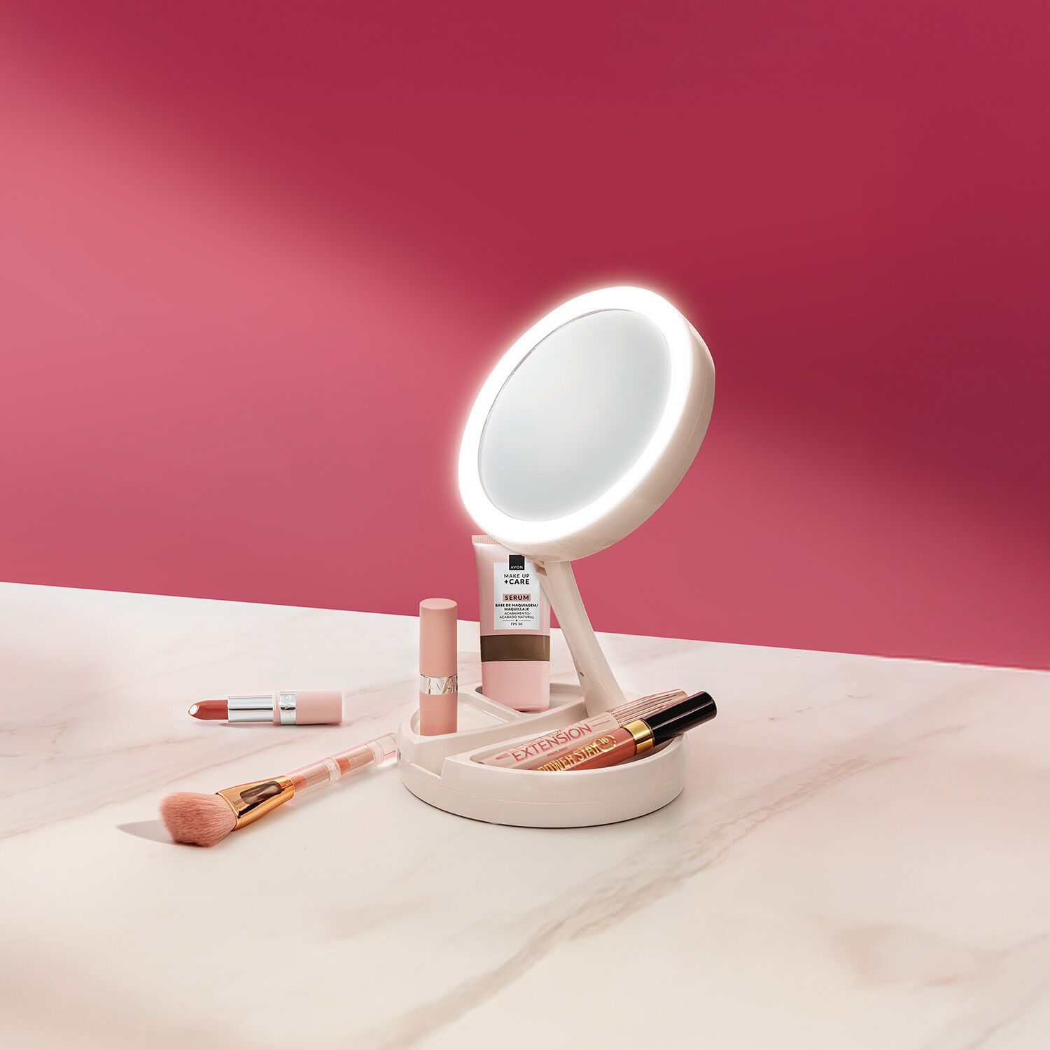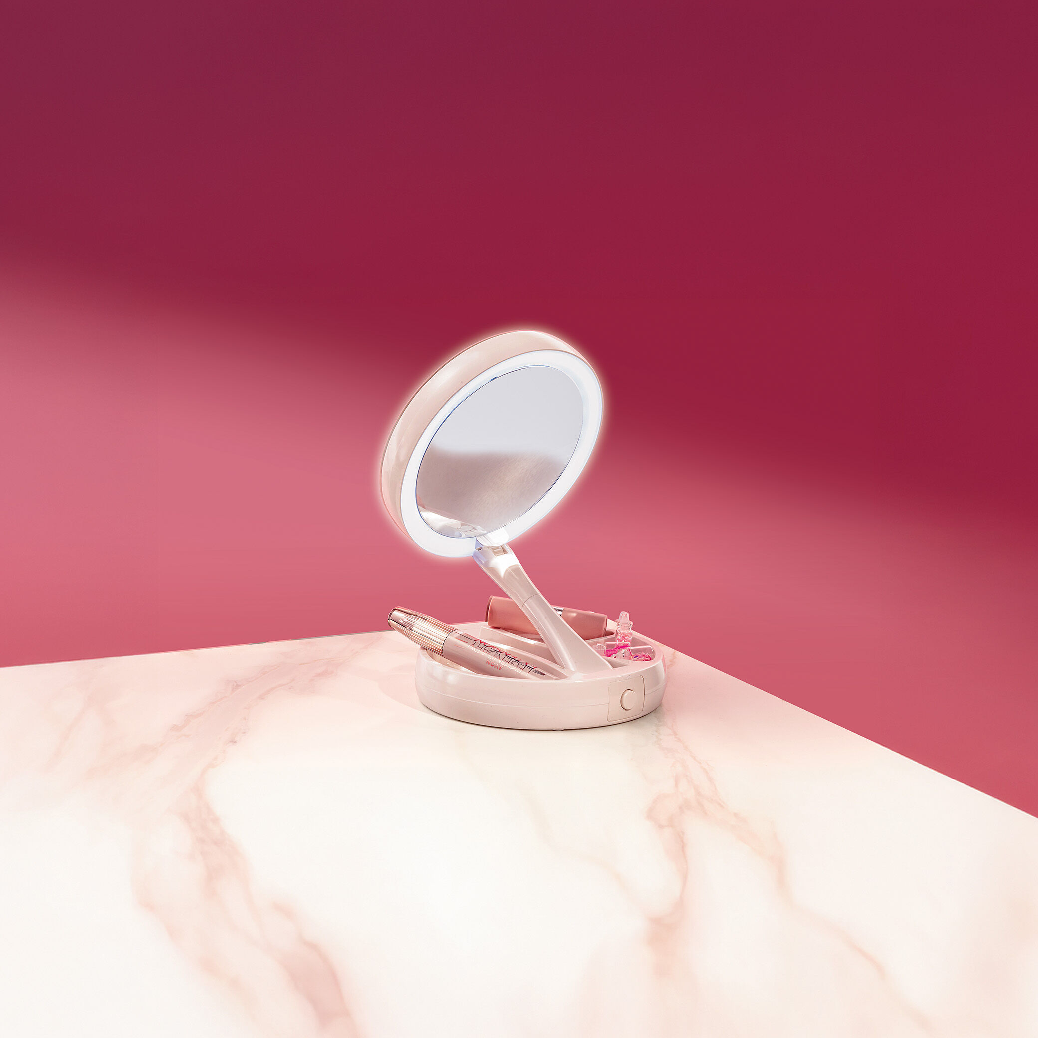 Com luzes LED e ampliação de 10x, o Espelho com Luz garante uma aplicação perfeita de maquiagem e cuidados diários. Dobrável e leve, é ideal para levar na bolsa ou mala, além de possuir um compartimento para itens essenciais.