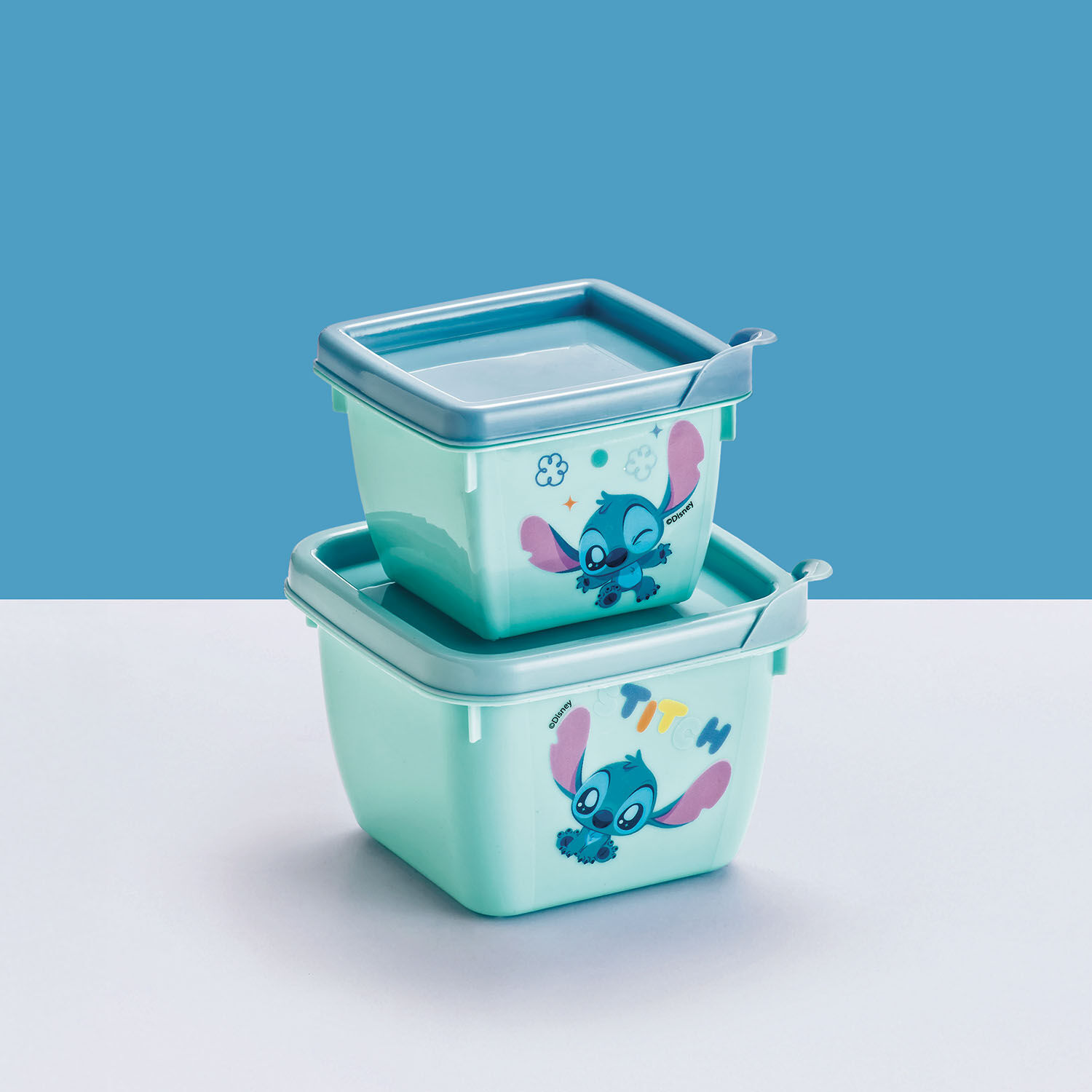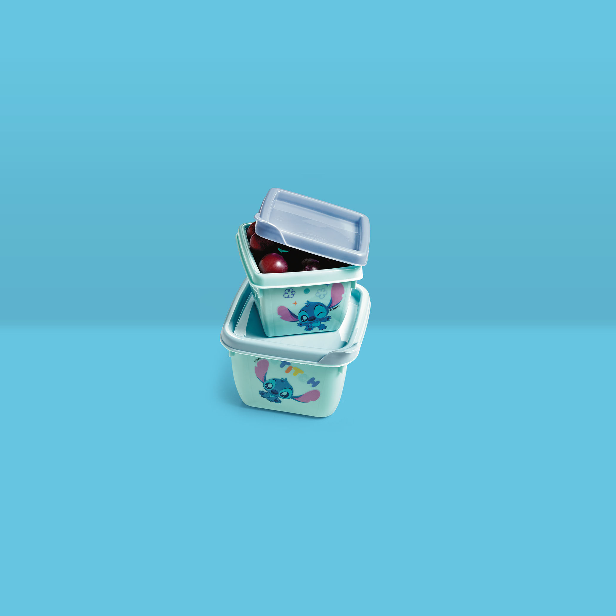 • Com uma estampa encantadora do Stitch, os potes se encaixam um no outro, otimizando espaço na hora de guardar.