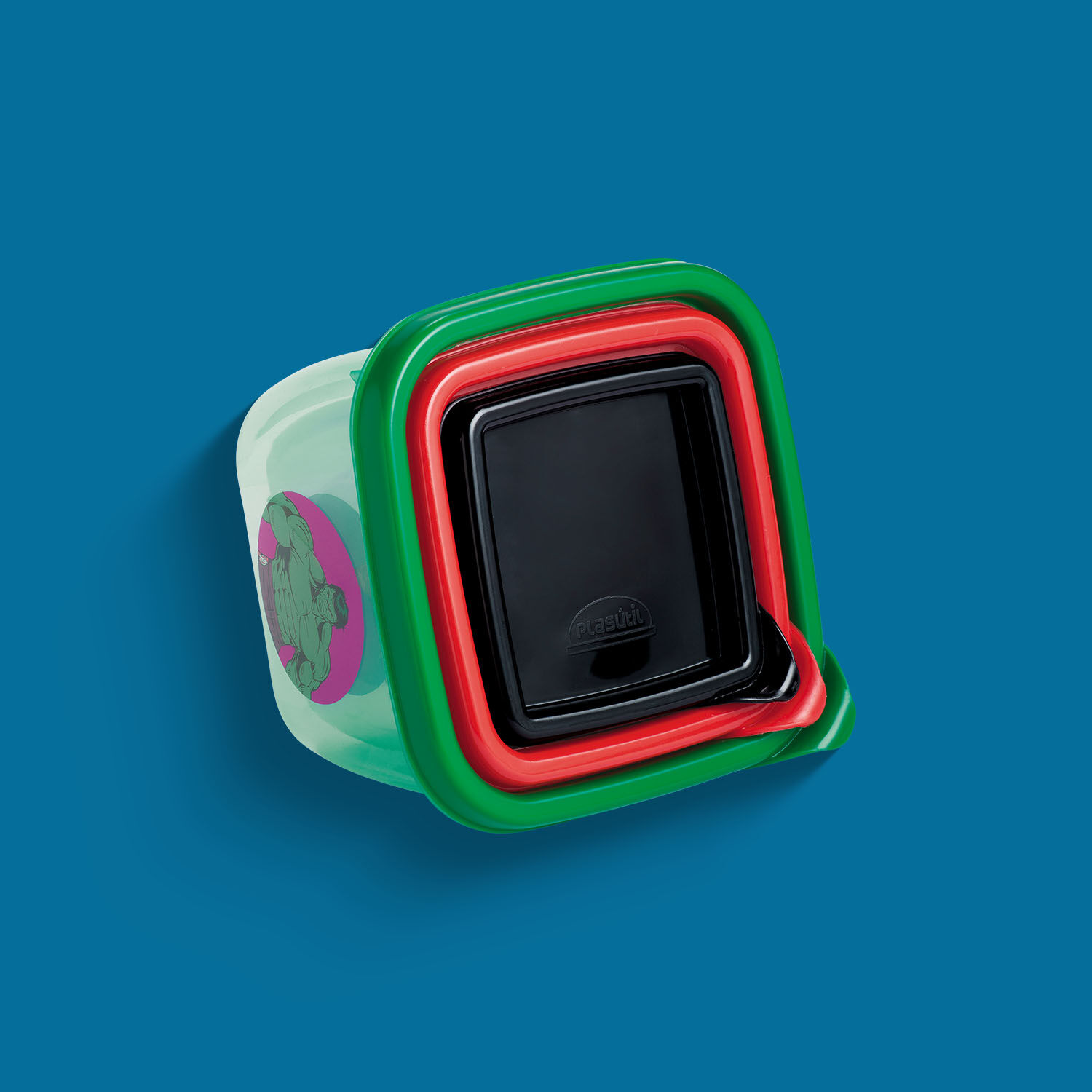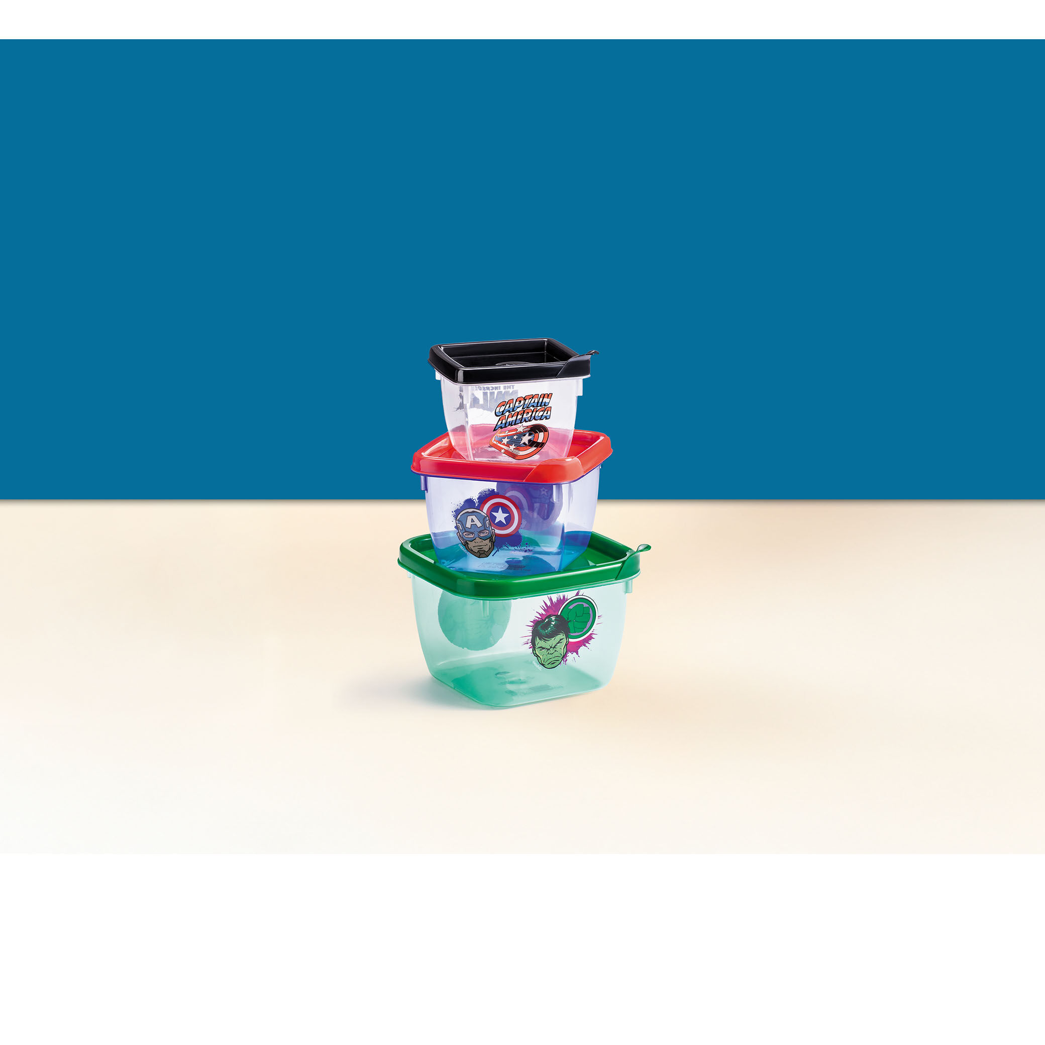 • Deixe seus lanches mais divertidos com o Kit 3 Potes Quadrados Capitão América e Hulk!